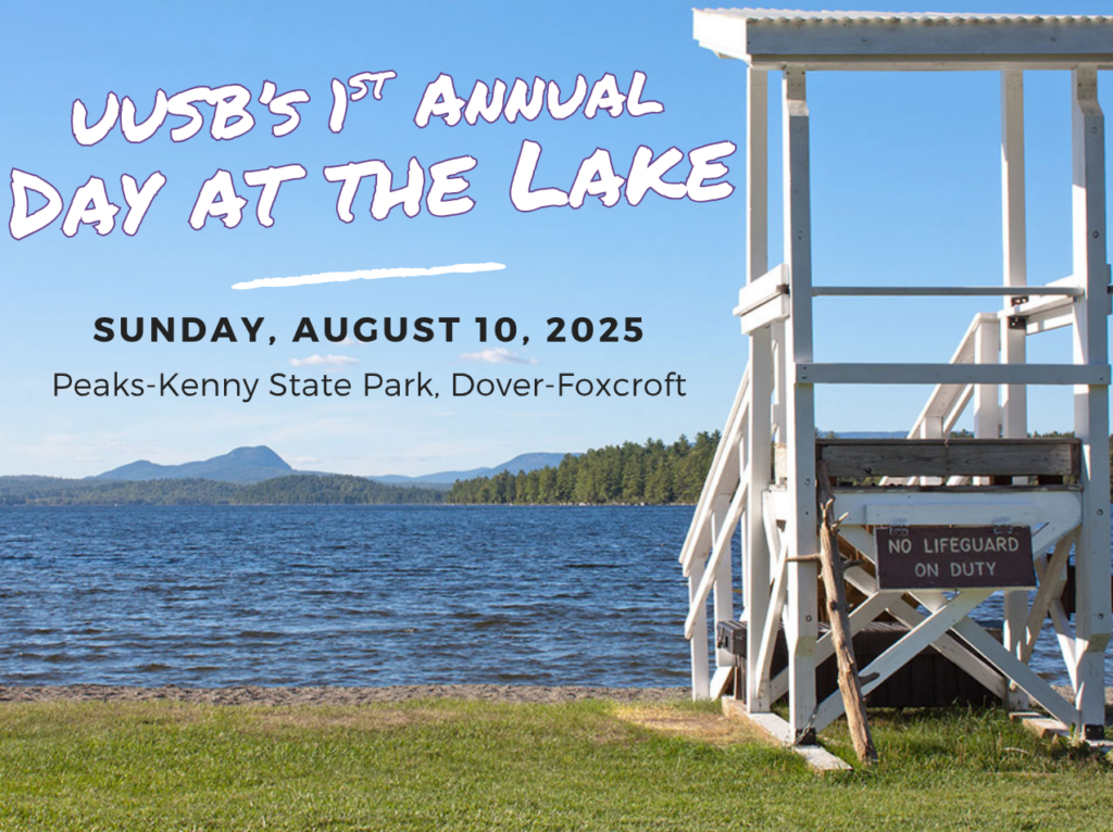 Sunday, August 10, Rain or Shine will be the first annual UUSB Day at the Lake! This all day event will be at Peaks-Kenny State Park in Dover-Foxcroft. Located on Sebec Lake, the park offers nearly 900 acres of old growth forest and miles of hiking trails. There’s a playground for the kids, a lawn area for games, a sandy beach, picnic areas and a large wheelchair accessible pavillion to keep us dry should the skies open up. Canoe and kayak rentals are also available. Carpooling is encouraged.