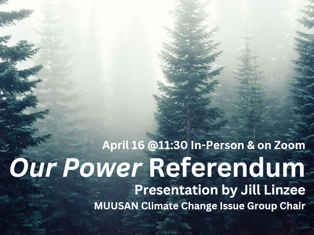 Jill Linzee, co-chair of the MUUSAN Climate Change issue group, will be sharing a PowerPoint presentation prepared by Seth Barry, Maine legislator and Our Power referendum advocate, on Sunday, April 16 after the service. The presentation will likely begin around 11:30 AM in the Community Café, downstairs in the SE Wing. She will include answers to arguments raised by the opposition. Jill is a dynamite advocate and presenter and all are welcome to attend!